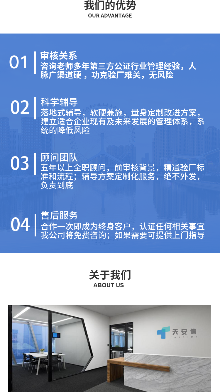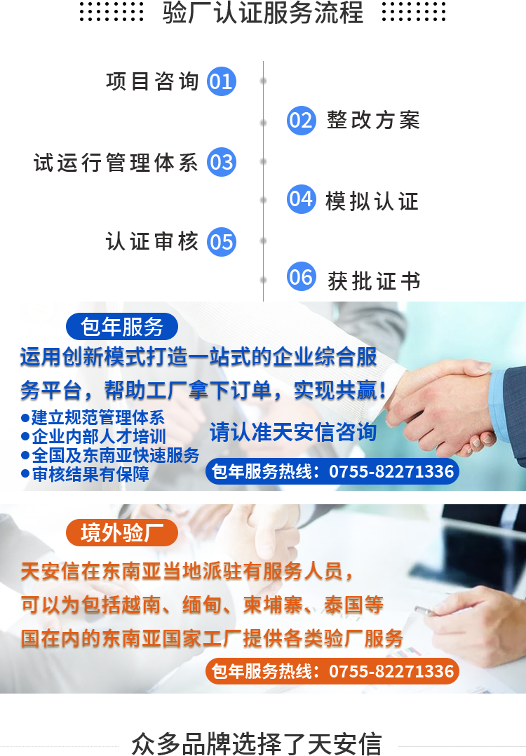 天安信企业管理顾问有限公司一家专业辅导社会责任人权验厂(COC)、反恐审厂(GSV/C-TPAT),质量审厂的咨询机构、客户验厂咨询、企业管理咨询、管理培训咨询。 完善的服务网络覆盖全国,顾问师正活跃在全国各地为不同客户提供咨询、培训服务。