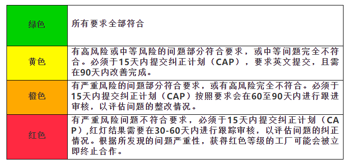 4、红灯:指有严重风险问题没有符合雅芳验厂要求。必须要于15日内填写CAP提交。红色雅芳验厂结果需要在30-60天内进行跟踪审核,以评估问题的纠正情况。根据所发现问题的严重性,获得红色等级的工厂可能会被立即终止使用。