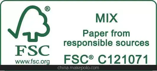 FSC Mix-混合来源标签:用于部分使用FSC认证森林原料、FSC受控木材和可回收材料生产的产品,标签文本为:“[产品类型] from responsible sources”。