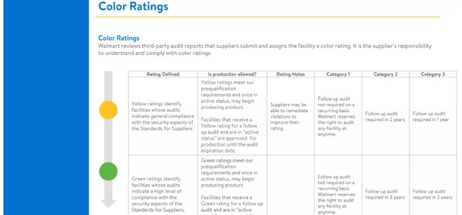 从2021年5月份开始,沃尔玛反恐的等级改为了绿色、黄色、橙色、红色四个等级。红色等级直接不能出货,需要进行跟进,橙色等级也是暂时不能出货,当拿到橙色等级时,工厂可以通过CAP改进,当CAP被WM接受后可以升级,得到一年的有效期,但是在CAP被认可前工厂还是不能出货的,另外,CAP需要收费,费用是250美金。拿到黄色等级时直接获得2年的有效期,CAP还是需要的。拿到绿色等级时,不需要提交CAP,而且可以获得3年的有效期。