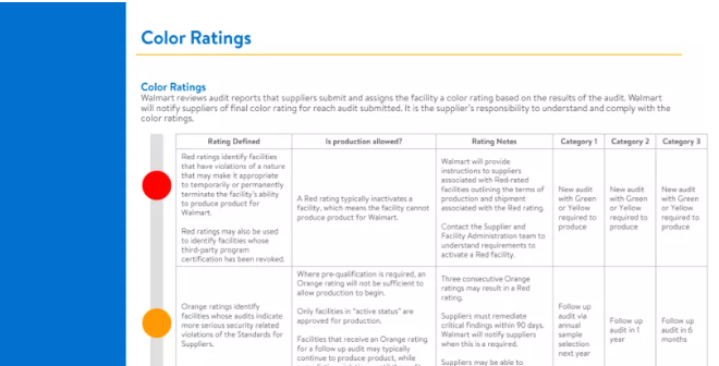 首先等级类别就增加了橙色等级,而且橙色等级相当于是一个待通过这样的一个等级,而且需要进行整改升级后方可达到旧标准中75分以上的效果,而且这个升级过程还会产生250美金的费用。另外,绿色等级直接变成了3年的有效期,这个对于工厂来说是一个好消息,但是我相信对于这个等级的工厂,沃尔玛肯定会加大监督的力度的。