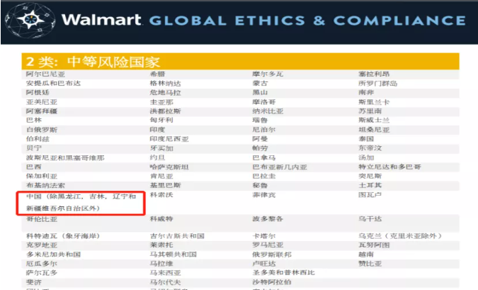 沃尔玛将国家和地区的风险等级分为三类,分别为1类国家-风险较低,2类国家-中等风险,3类国家-风险较高。其实还有一种是禁止采购国家。我们中国被沃尔玛划分到了2类国家-中等风险,但是还有几个例外的地区,那几个地区是被分到3类国家-风险较高了。