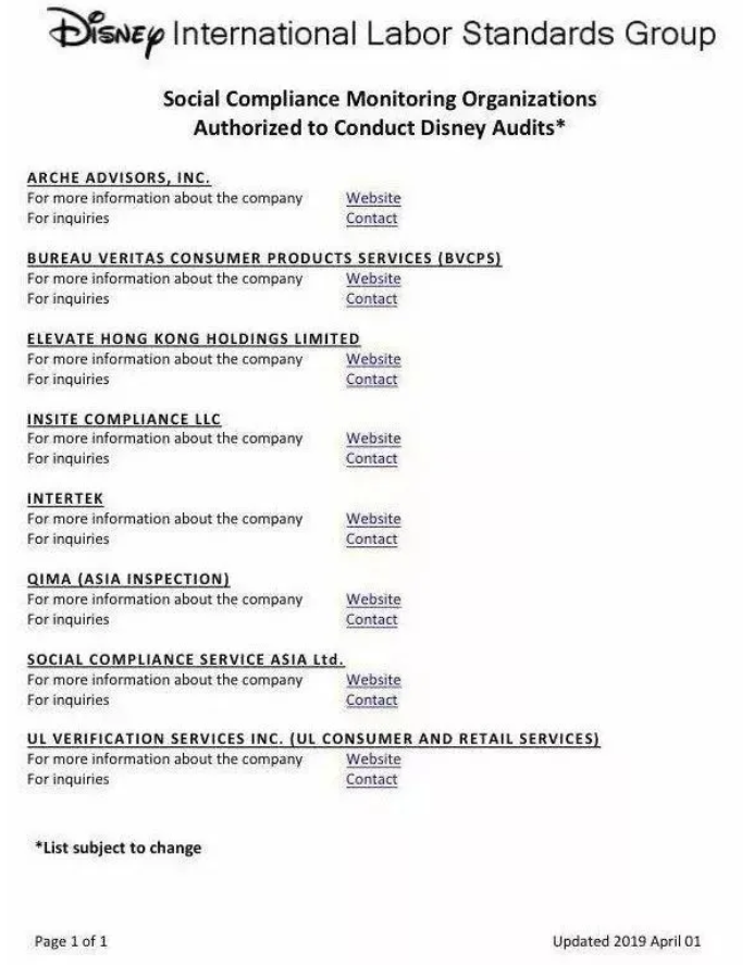 Disney官方网站公布,2019年4月1日起,Disney认可的审核公司有调整,数量还是8家,但是有增减。