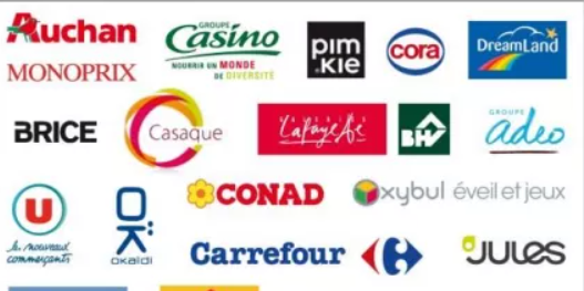 3 Suisses, Adeo groupe, Auchan, Bizzbee, BHV, Brice, Carrefour, Casino, Club Méditerranée, Colruyt Group, Conforama, Cora, Galeries Lafayette-BHV, Jacadi, Jules, Monoprix, Okaidi, Oxybul Eveil et Jeux, Pimkie, Sourcing & Création and Système U )等等。
