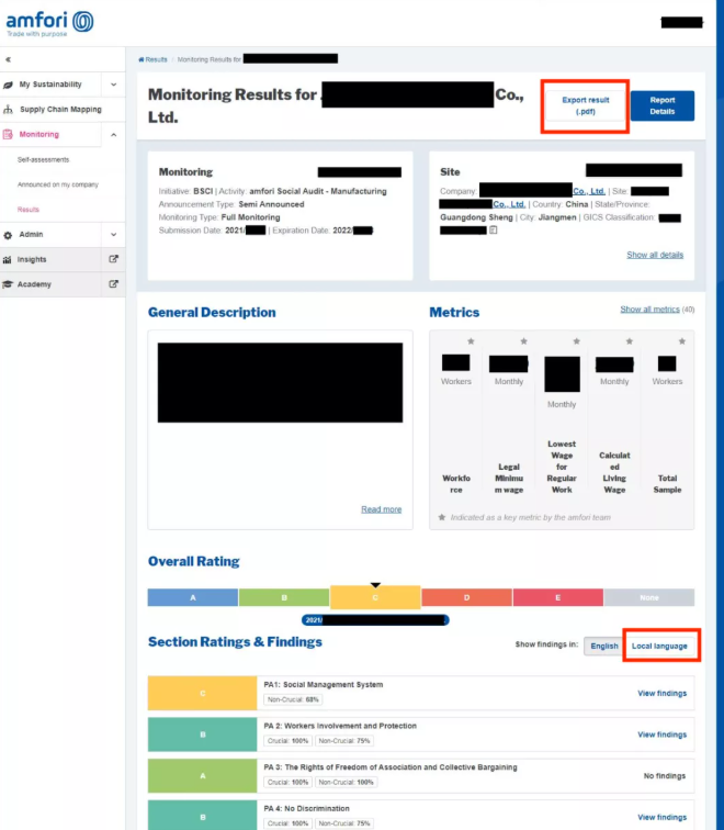 4. 这个页面可以查看该次审核的总结,如需转换成中文,请点击Local language(本地语言)。如需下载报告,请点击右上角的 Export results(导出结果)。如需查看每个绩效领域的更多详情,请点击右上角的 Report Details(报告详情),此按钮仅出现于在可持续发展平台上要求的审核。