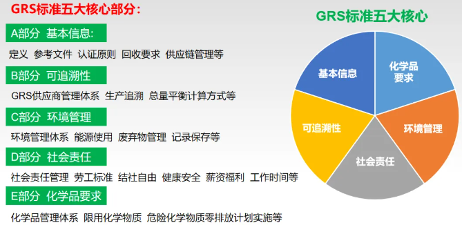 1、GRS认证是一项国际、自愿和全面的产品标准,规定了回收内容、产销监管链、社会和环境实践以及化学品限制的第三方认证要求。主要针对于纺织业的所有供应链。GRS的目标是增加产品中回收材料的使用,并减少/消除其生产所造成的危害。