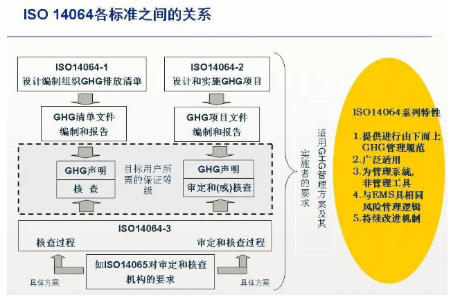 ISO14064是一个由三部分组成的国际标准,该标准体系系统的规定了国际上通用的温室气体资料和数据管理、汇报和验证模式。组织可以通过使用标准化的方法,计算和验证排放量数值,确保其所声明的每1吨二氧化碳减量或移除量都是经过科学的监测、报告和核证而得出的结果。
