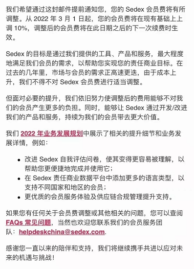 最近SEDEX会员们都陆陆续续收到SEDEX官网发出的会员费调整通知:B会员的会员费将在2022年3月1日上调10%,有需要的可在2022年3月1日前续费,调整后的会员费将在此日期之后的下一次续费时生效,上调后会员费由原来的1200元变为1320元。